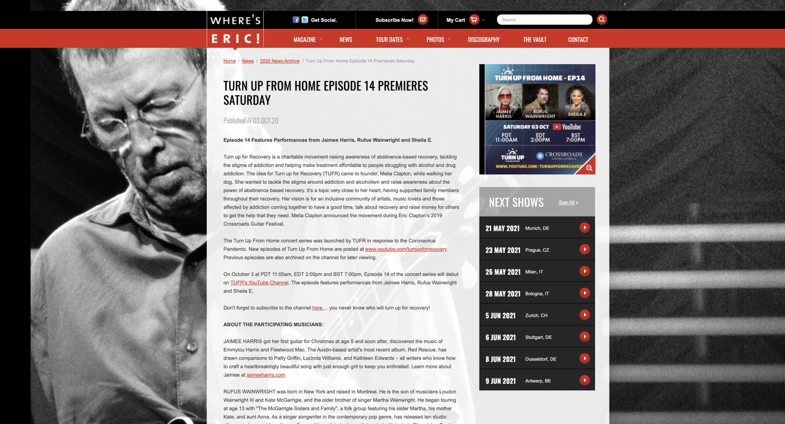 On October 3 at PDT 11:00am, EDT 2:00pm and BST 7:00pm, Episode 14 of the concert series will debut on TUFR's YouTube Channel. The episode features performances from Jaimee Harris, Rufus Wainwright and Sheila E.